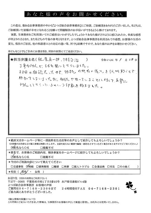 最初、家族が亡くなり辛い中、相続問題がおこりどうしていいかわからない状態でしたが、常にあたたかい雰囲気で、こちらの不安や疑問に対して、何度も同じ事を聞いてしまったと思うのですが、その都度丁寧に答えてくださり、安心感がありました。