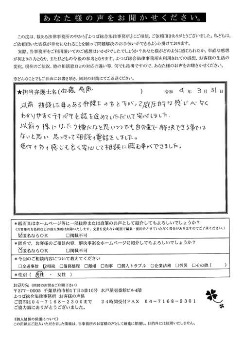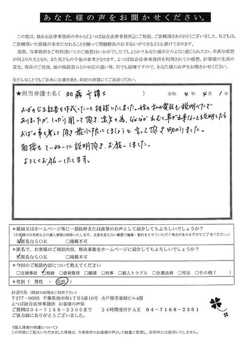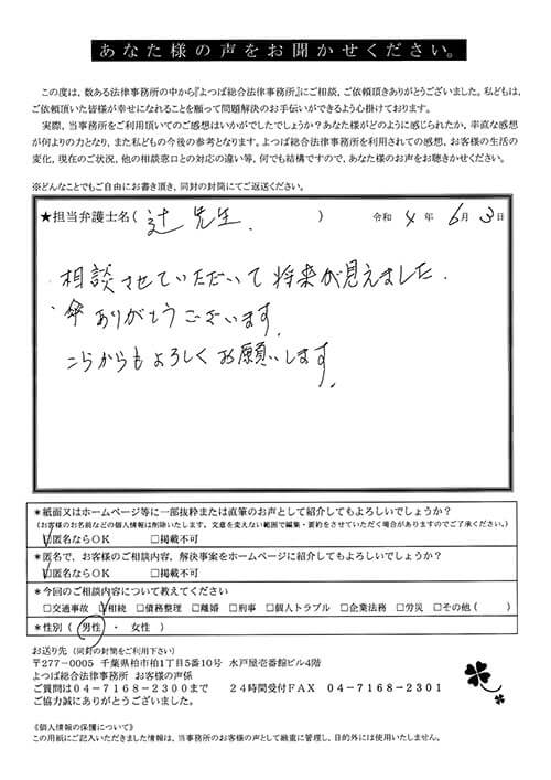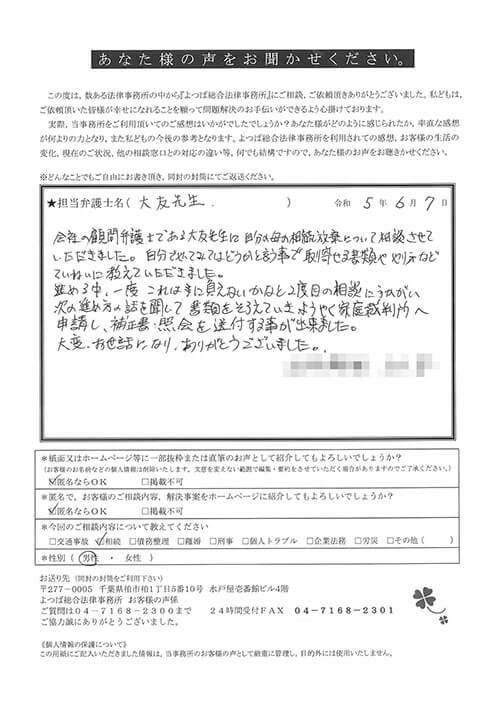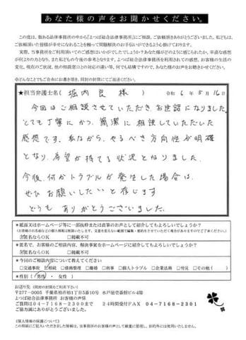 このように長引くとは思ってもみませんでした。しかし調停から審判まで移行したことを見ると、やっぱりよつば総合法律事務所に縁があり、依頼したことは間違いでなかったと自覚しております。