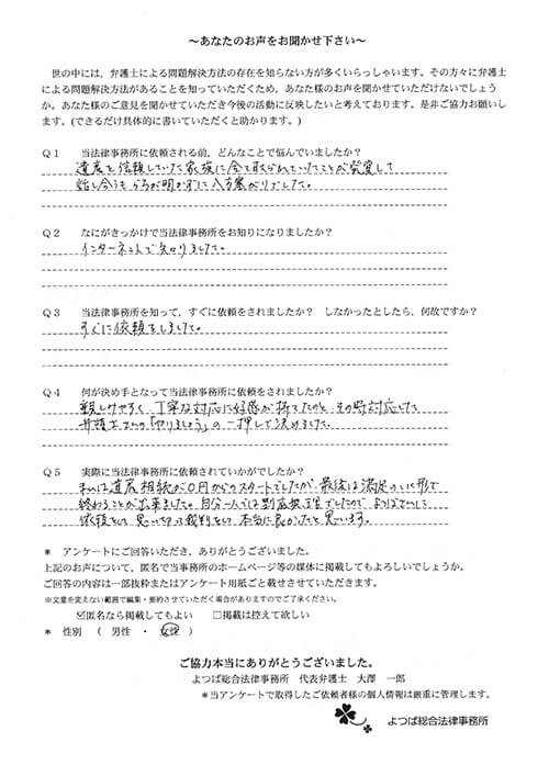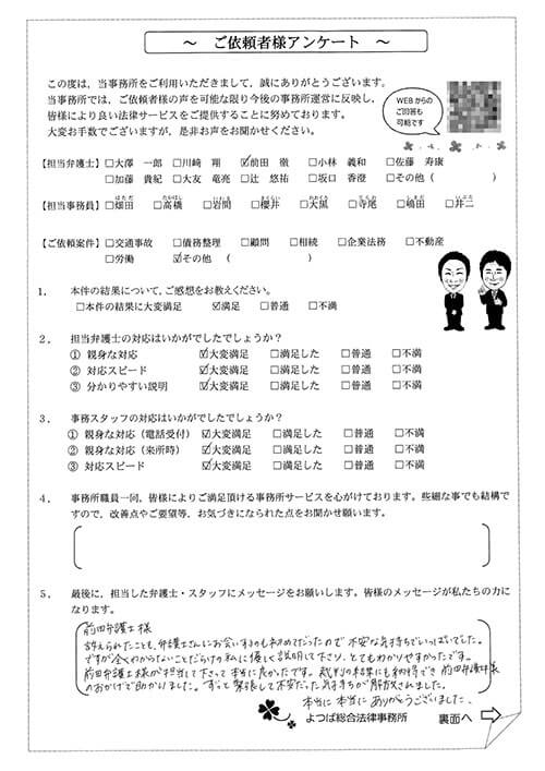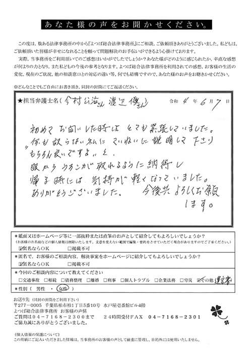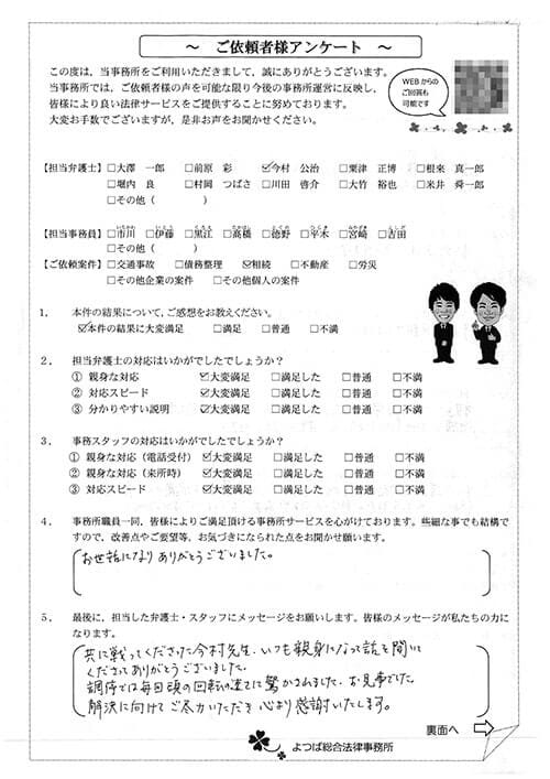 担当の今村先生は首尾よく遂行して、当初、これ程難しい案件とはつゆ知らず、相手方の性格を心得ていきおかげさまで納得のいく結果を得られました。