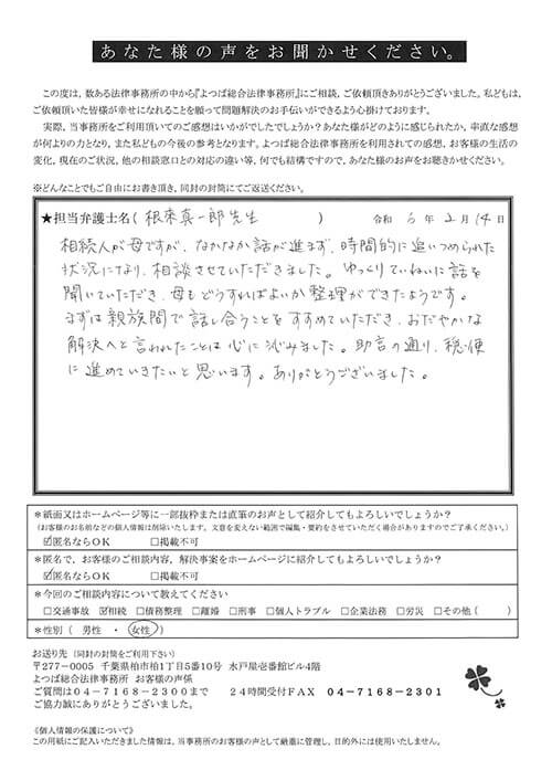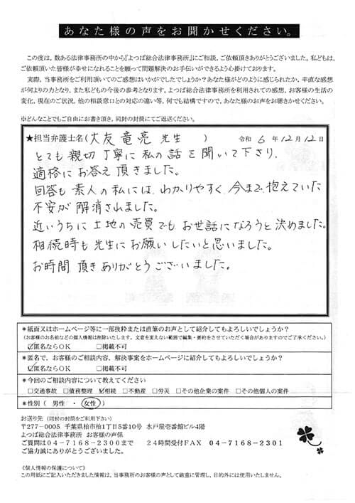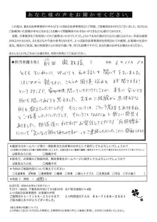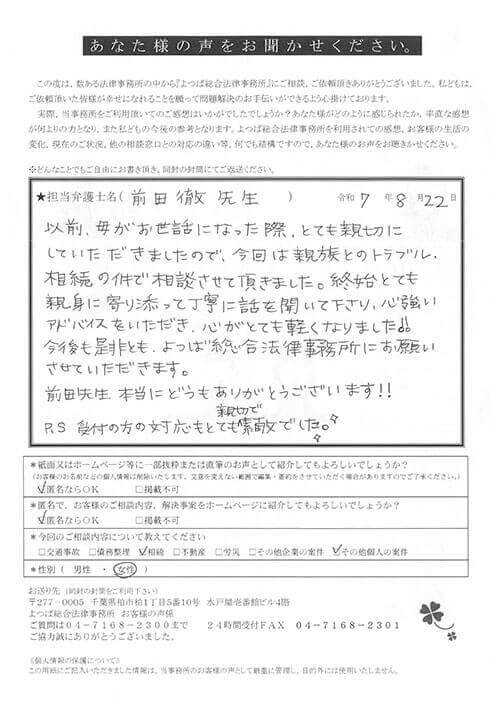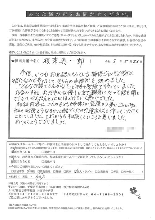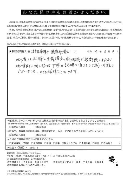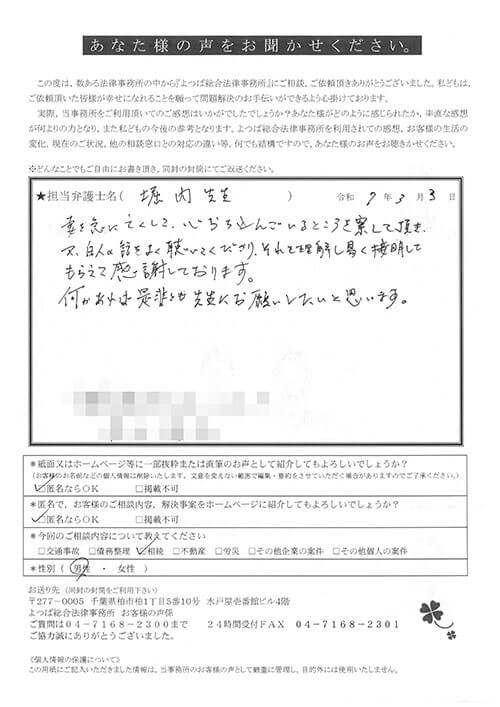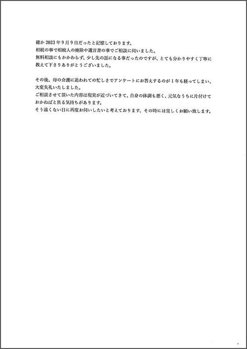 このたびは、父の相続に関する複雑な相談に丁寧にご対応いただき、心より感謝申し上げます。
