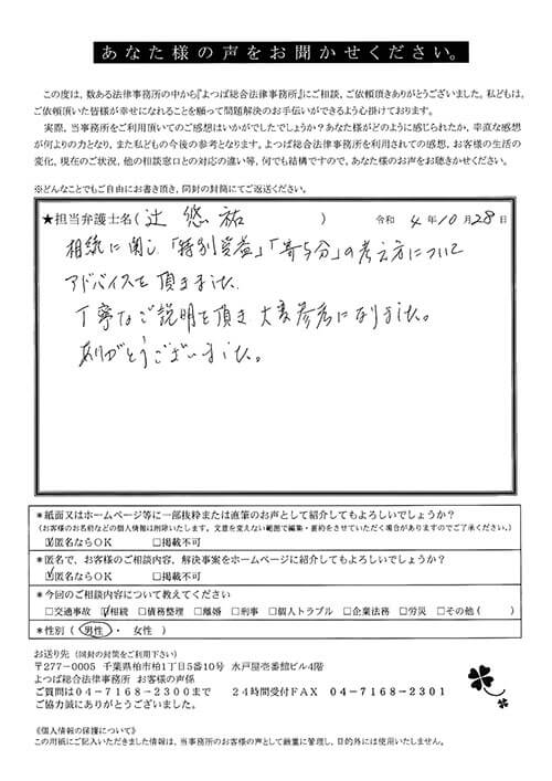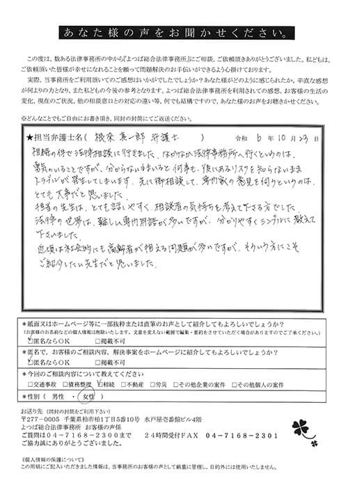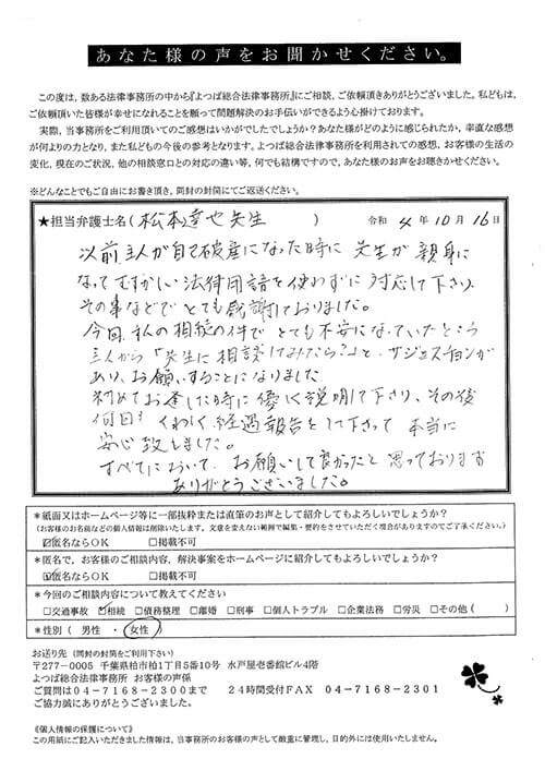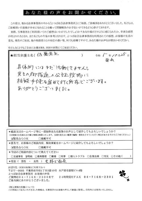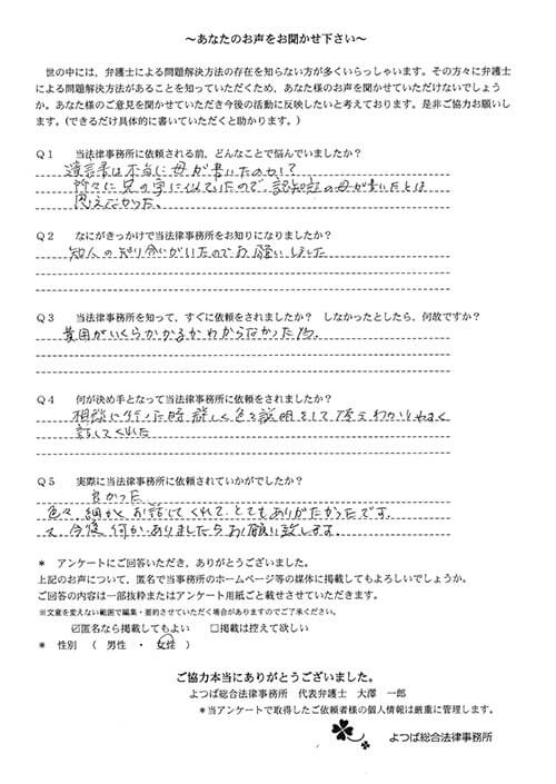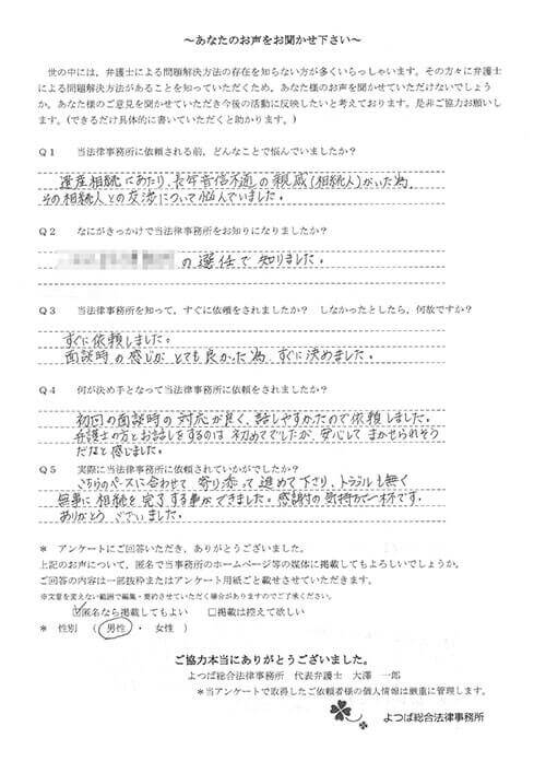 法定相続人以外の財産分与について悩んでいました。知人の紹介でこちらを知り、すぐに依頼しました。改善点や要望等は一切ございません。