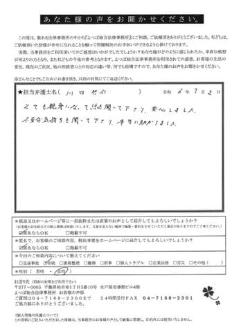 裁判を起こされ、どうしてよいのかわからない中、私にわかりやすく説明をしてくださったり、お話を聞いていただき、こちらの事務所に依頼し本当に良かったと思いました。