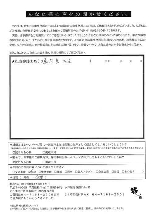 結果そのものについては、判断基準を持ち合わせておらず、なんとも表現のしようがありませんが、当方の想いをよく聞いてくださり、また、法的解決、見解を大変ご親切にご教授くださり、心から感謝しています。