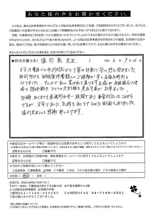 私の話を最後まで真剣に聞いてくださり、事実関係を丁寧に整理していただけたことで、気持ちがずいぶんと軽くなりました。