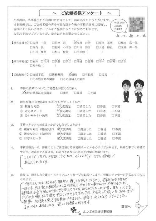 多人数の相続人のいる相続で、分からない事だらけで不安でしたが、疑問点も全て分かりやすく説明して下さり、ありがたかったです。